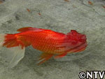 悠々と泳ぐ巨大金魚を待ちうけ、万全の体制でモナカを水中へ!
