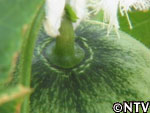 充分な水分を与えられ膨らんだマスクメロンのヘタに、白い網目模様の始まりが!