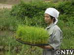 普段の田植えに輪をかけて慎重に植えていく男たち。