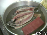 先ほどのアジのひらきと、マグロの刺身を塩水につける。