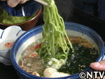 そして透明な塩ベースのスープの中から出てきたのは、綺麗な緑色をしたちぢれ麺。ひと口食べた長瀬は、麺に練りこまれた枝豆がかもし出す風味を、気に入った様子だ。 |