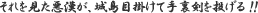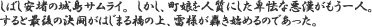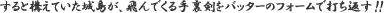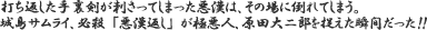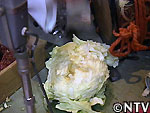 手裏剣が刺さる音「グサッ!!」(待ってましたと、達也が新鮮なレタスをコテで刺す)