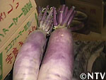 こちらも佐賀県の特産、女山大根。茎に近い身の部分が紫色をしており、ポリフェノールを多く含むその味は、普通の大根よりも甘味が強く美味しいという。