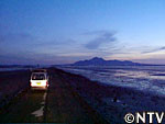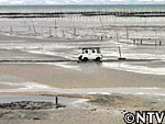 だが、干潟の中へと続く道の途中で、あえなく溝にタイヤをとられてしまった。