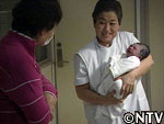 孫の誕生を心配そうに待っている。そこへ看護婦さんが赤ちゃんを連れてやってきた。