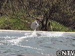 ヘビにビビりながらラジコンを網で救出。救出直後、目の前には堰。真直ぐ行けば高さ2mの落下となるが、山口と松岡は迷わず、直進。