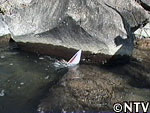 ボートを下りて、川沿いを歩いていると、岩場にハマっているサンストーム号を発見。ようやくの救出。