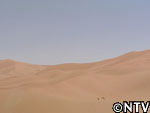 ラクダを降り、徒歩で広大な砂漠を行く城島。