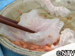 この肝をしょうゆでとき、メイタガレイの刺身につけて味わう。スタミナもさることながら、味のほうも魅力的な「メイタガレイの洗いと肝醤油」をいただく城島。