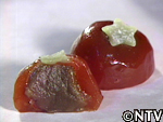 外側の生地に奈良県の吉野葛を使用し、トマトを内側のアズキと外側の葛にも混ぜ込んだスィーツ。