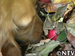 それには「コング」と呼ばれる道具を使う。このコングにエサを詰め、はなちゃんでも掘りやすい落ち葉の中に埋めてあげる。