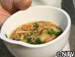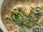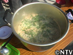 | 3,鍋に、こした蟹の液をそのまま入れる。この際にかき混ぜすぎるとうまく固まらなくなる。ゆっくりそっとかき混ぜるのがポイント! 4,煮立ってきたところで高菜・餅・大根・人参等を入れる。「高菜ができたら蟹が凍る」と地域では言い、高菜の収穫できる時期に獲れる蟹は固まりやすいという意味。春先を越してしまうと、蟹の身が鍋にしても固まらなくなるため。 5,醤油で味をつける 6,一煮たちすれば完成 |