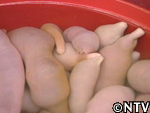 冷麺をいただき海のほうへと向かっていた城島・徳山さんチームは、港の市場で元気な売り子のおばさんに話を聞くことに。すると、サービス精神旺盛なおばさんに、なにやら怪しい生ものをいただいた城島。おそるおそる口に運ぶと磯の香りが広がり、意外にもおいしくいただいてしまう。しかし、同じものを食べた徳山さんのお口には合わなかった様子。 |