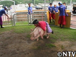 必死に豚にしがみ付く城島、すぐに振り落とされるかと思いきや、予想を上回る好記録。まずまずの手ごたえを感じた城島。彼ならチャンピオンに勝てるか!?