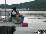 豚ロデオと同じく、西予市三瓶町のご当地競技。勝ってこの町にその名を知らしめたいところ。ルールはタライに乗った選手を押して、8.8mのレールの先端部にどれだけ近づけられるかを競うもの。まずは、かつてこの競技を制したチーム、小野さん夫婦から競技開始。計算された力の入れ具合で、絶妙な位置にタライを止めてみせる。 |