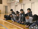 児童たちが横一列に並んで、紙コップに向かって歌ってみる。