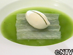 きゅうりのジュレ(ゼリー)の上に柚子胡椒で味付けされた6〜7枚の的鯛を並べ、その上にトマトの水分だけで作られたフラッペ(白いアイス状のもの)がのせられている。