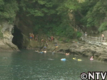 洞窟の付近の飛び込み台から、次々に飛び込む子供たちを発見。
