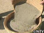 十分に乾燥したエゴマの実を、ゴミを落とすために脱穀をしていく。