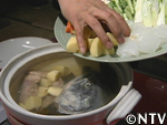 鍋のベースは北海道の郷土料理でもある三平汁。最後にもろみの泡を入れて完成!