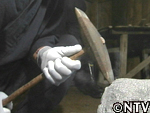 そして、ある程度型が取れたら、次はノミやハンマーでゴツゴツした側面を叩いていく。良い石臼にするためには、側面も重要。細かい作業だが、丁寧に仕上げていく。 |