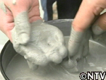 早速城島も泥湯を体験。4メートルもある柄杓を使って泥を酌み、体に塗っていく。