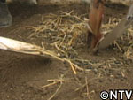 すっかり弱ってしまったバナナに、少しでも元気になってほしいと祈りを込めつつ、肥料としてヤギ達の糞を集め、バナナの周りにまき、ワラをかぶせ、水もたっぷりと与える。 |