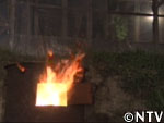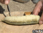 バナナの葉でしっかりと実を包み、水をつけて火の中へ入れ、そこに土をかぶせる。