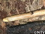 漆が皮膚に触れるとかぶれる恐れがあり、取り扱いには細心の注意を払うという条件で、早速、漆の樹液を採る現場に連れて行ってもらう。 |