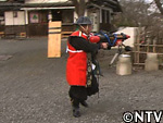 その瞬間、松岡が飛び出し、屋根の上から旗を狙うが、