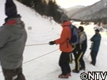 最後の斜面、スキー場のみなさんのご協力を頂き、総勢16人で『おゆき』をロープで引っ張る作戦。