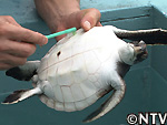 歯ブラシなどでやさしく汚れを落としてあげると、アオウミガメたちも気持ちよさそう。