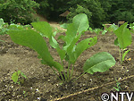 畑の周囲を竹で囲み、その中に木酢液を流し入れ、卵を生みに来る蝶の侵入を防ぐ。