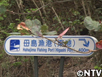 山を越えて、下るその先にさらに見えてくるのは、島の東に位置する、母島漁港の看板。 |