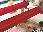 通常、風船作りは余分な原料液を流れ落とすため型を縦にして行なうのだが、長さ4mの型ではそれも不可能。そこで、型を横に寝かせ原料液に浸していく事に。