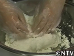 まずはうるち米、もち米の粉5kgに砂糖1kg、塩少々混ぜたものに熱湯を加えて練り混ぜる