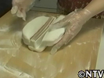 次に、その包んだもちを重ね、真ん中を潰す。 |