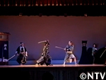 町奉行の大岡越前の活躍を描いた生の舞台で繰り広げられる迫力のチャンバラ劇場に見とれる、太一と城島。