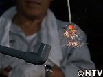 線香花火に直接パイプで吹いて空気をおくり、温度を上げる作戦。