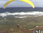 糸満市米須海岸から太平洋上へ、モーターパラグライダーで空へ飛び立った所だった。城島のくぐりたいトンネルは空にあった。 |