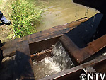 羽根板一カ所分で8L。送られた水の向こうではアイガモ達も泳ぎ出す。