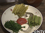 そこへ、梅びしおをたっぷりとつけ、香りが楽しめるおひたしに。
