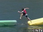 40メートル並んだ浮き島を渡り切る時間を競うタイムレース。