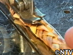 ここから本番、幅12ミリの2本の藁を中央をはみ出さずに縫う作業。 |