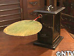 明治時代に、名古屋で発売された道具。つまみを引く事によって、穴に挿しこんだ団扇を上下に動かし風を送る道具だった。