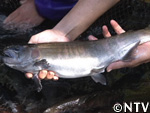 イクラを調達するべく、達也はいけすの中でヤマメの選別。