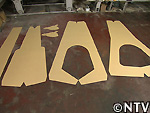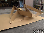 その紙は、薄いが中芯が厚く、一般のものと比べ3倍の強度を持つ強化段ボール。そこから全身合わせて計6パーツを切り出す。