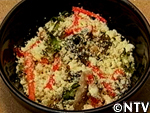 豚肉、にんじん、そして沖縄島野菜シカクマメをニンニクで炒めたら、念珠藻を入れ、最後におからを炒めて、念珠藻入りおからイリチーの完成。