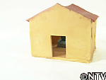 包丁で入口と窓をカット、高温ドライヤーで溶かしながら節目を接着し、不安定ながらも、シンプルな外観の家が完成!