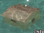 そして、クラレの皆さんの力もお借りして、プールの縁からゆっくり投げ入れる…家は見事プールの真ん中付近まで到達。